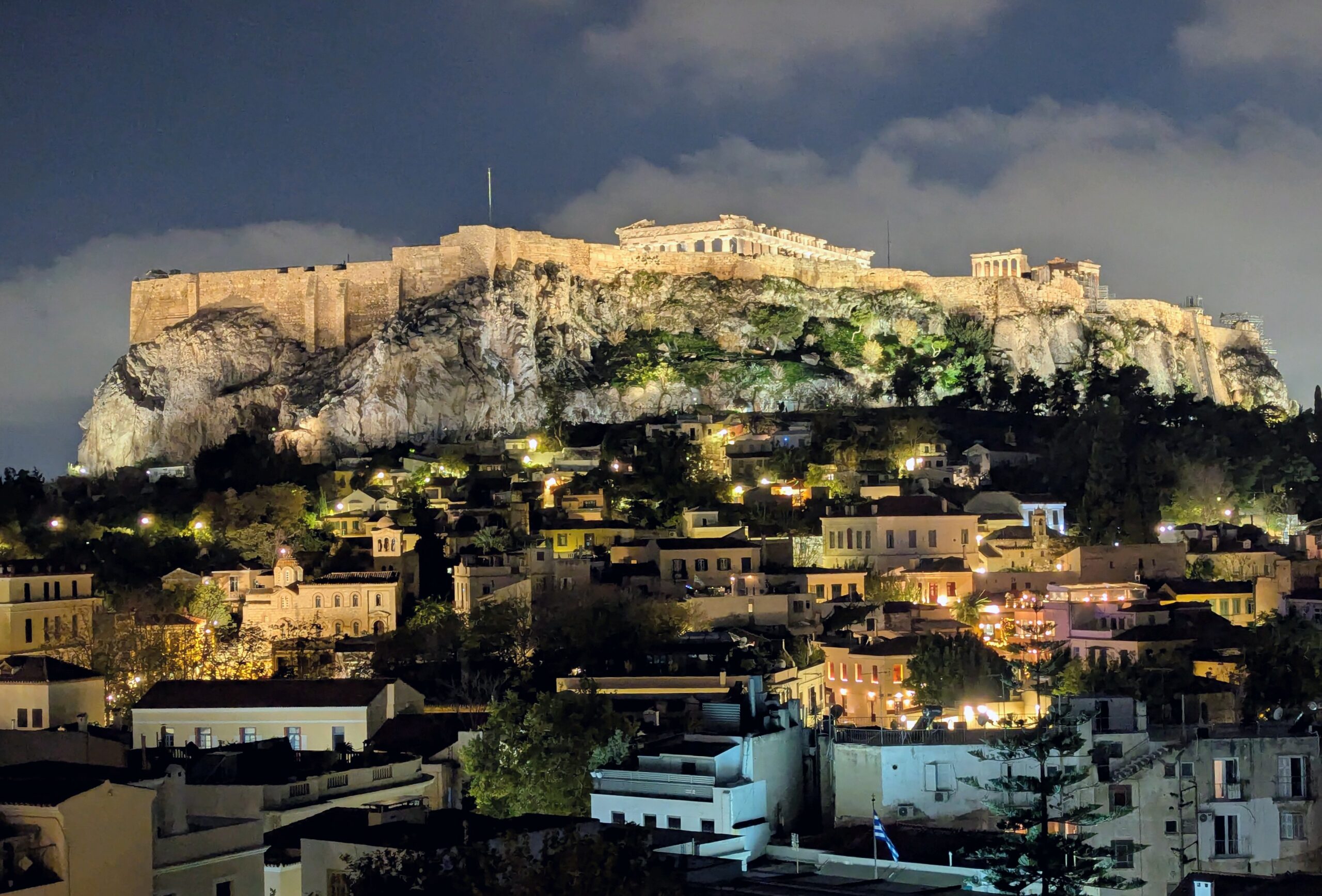 Dinner with a view from the 7th floor restaurant Thea Terrace in Athens, Greece. Lots of History up on that rock. Meal was moussaka: roasted eggplant rolls stuffed with ground beef ragu in a rich potato cream.