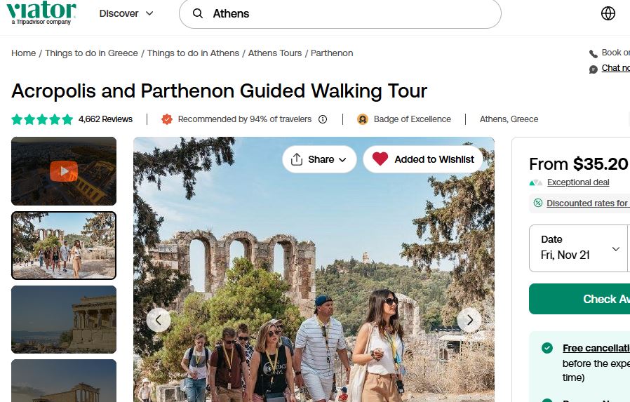 Tuesday November 4th was my only full day in Athens I booked a tour of the Acropolis. The tour started at 9:00 a.m., a 10-minute walk from my apartment. I stopped for coffee and a bread cheese thing along the way. Weather is perfect, a bit humid in the 70s.