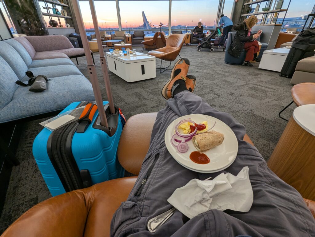 Saturday night I flew from Sacramento to Newark. Then Sunday night I flew from Newark to Athens. I spend Sunday in the United Lounge, which was quiet and comfortable – beat a day at the office I suppose.