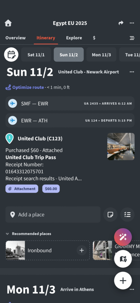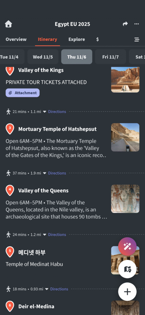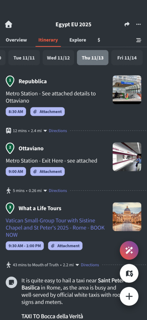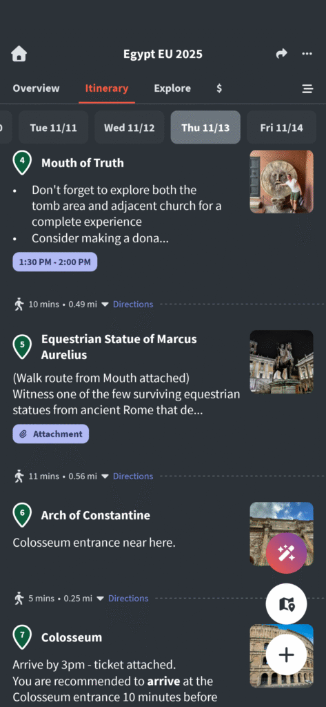 I planned and managed this trip with Wanderlog. It keeps everything in one place. I generates map and time estimate between stops. It syncs on multiple devices, and with the paid plan it works offline and supports attachments.